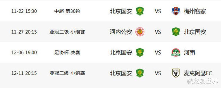 11月22日,中超第30轮,国安主场迎战梅州客家,27日亚冠2客战河内公安,这是足协杯决赛对阵河南之前最后两场调整。11月14日,国安热身赛2-1战胜津门虎,张玉宁和达万破门。国安末轮不仅要赢球,还要帮助法比奥刷进球,争夺金靴。梅州客家保级命悬一线,但对不起了,梅州!