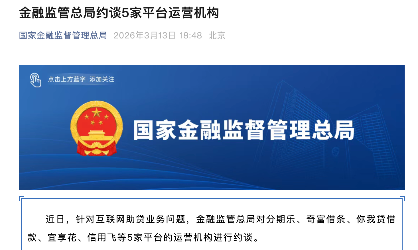近日,针对互联网助贷业务问题,国家金融监督管理总局对分期乐、奇富借条、你我贷借款、宜享花、信用飞等5家平台的运营机构进行约谈。